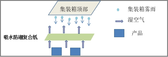 吸水防潮复合纸是一种复合材料。由表层吸水纸、超强吸水剂、底层防漏纸复合而成。箱内壁上形成的水珠下落时,由表层吸收,传递至超强吸水剂吸收固定,不再释放。国内独家生产的该产品是一种可降解的环保型复合材料;已在集装箱运输领域使用12年。设计吸水量为500-3000g水 /平方米,能有效地吸收集装箱内产生的液态水及少量的气态水。