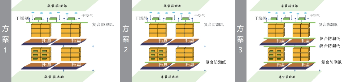 运输工具中加以防护措施,采用复合防潮纸吸收运输过程中产生的液态水,采用绿色安全高效的干燥剂包吸收环境中的水汽,对商品持续保护。