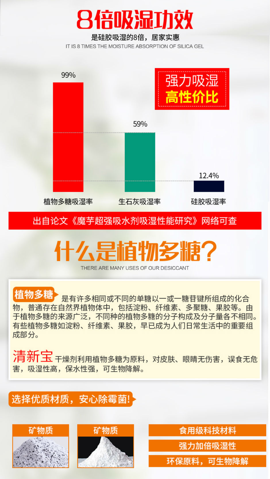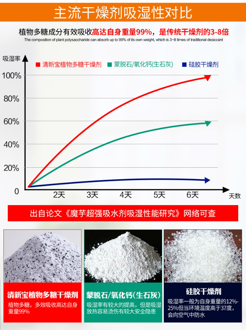 植物多糖的特性:植物多糖成分有效吸收高达自身重量99%的水分,是传统干燥剂的3-8倍。同时在安全程度上,传统干燥剂所含的化学物质如果吸收及皮肤接触有害,刺激眼睛,可能对胎儿造成伤害,甚至有的干燥剂采用生石灰做原料,吸湿放热的过程中容易导致烫伤有安全隐患。而清新宝干燥剂使用植物多糖为基础原料,更亲肤、更安全,无有毒有害残留生成。