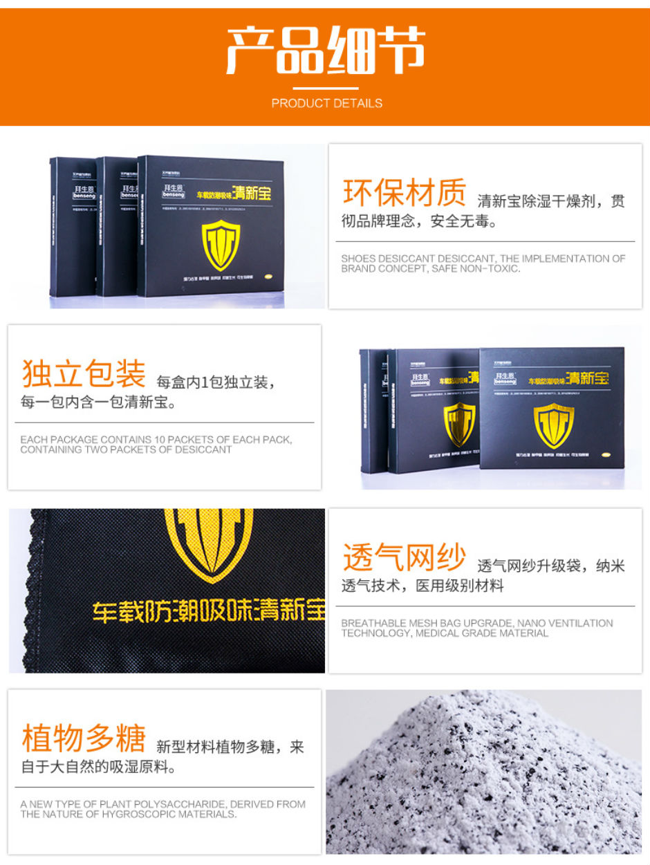 产品说明:车载防潮吸味清新宝植物多糖、矿物质材料等精制而成,外观呈粉末状,具有优良的吸湿保水性能。