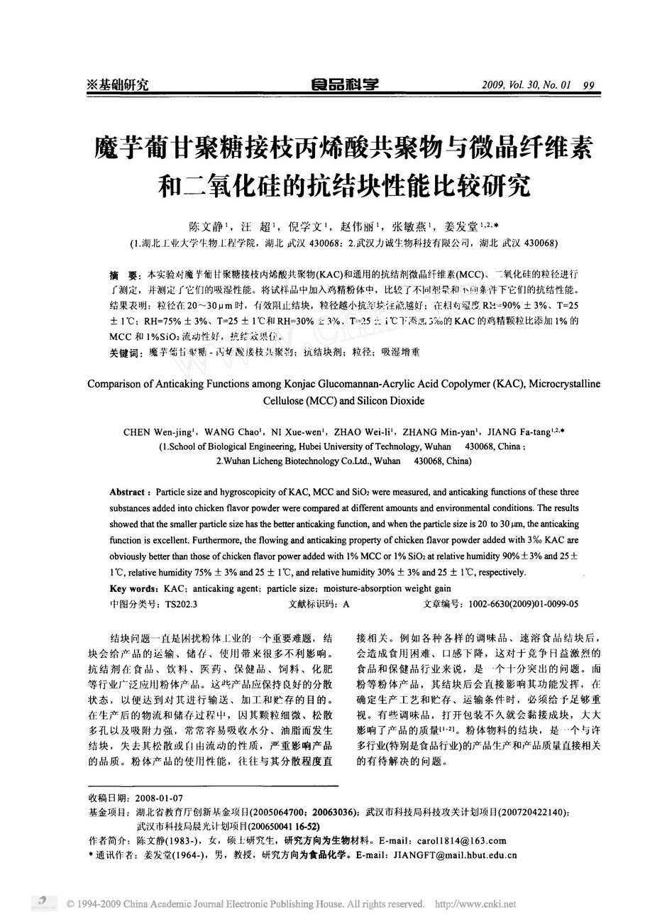 魔芋葡甘聚糖接枝丙烯酸共聚物与微晶纤维素和二氧化硅的抗结块性能比较研究
