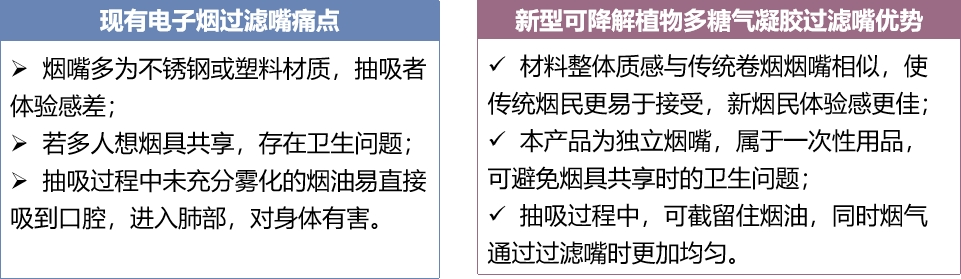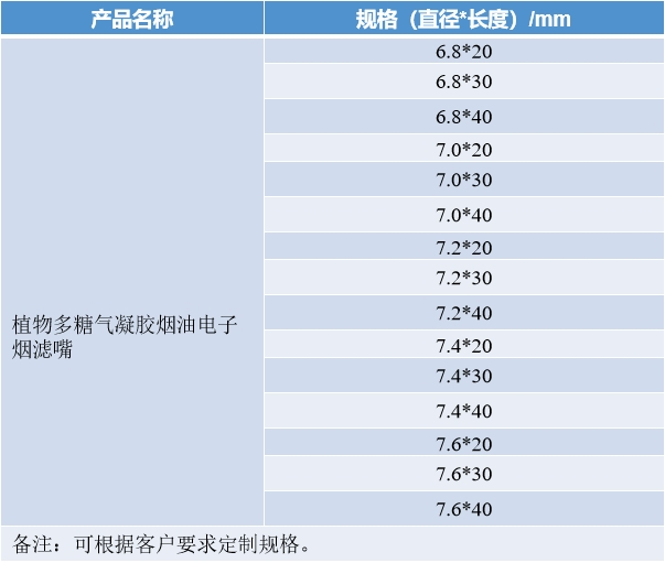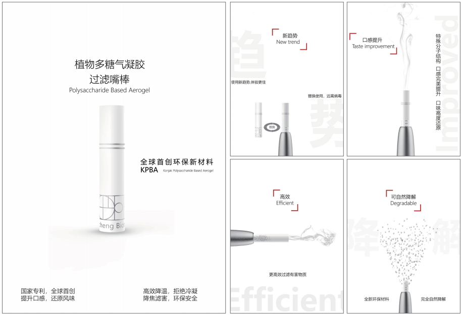 本产品采用植物多糖-魔芋葡甘聚糖为核心材料,辅以天然生物质通过溶胶-凝胶、真空冷冻干燥的方法一次成型制备而得,可用于烟油电子烟过滤嘴。